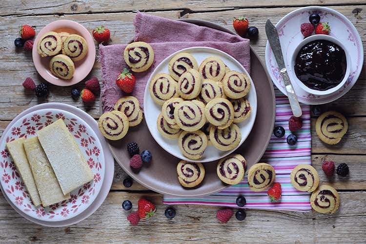 Stendila su un piano di lavoro infarinato fino a ottenere un rettangolo di 20x30 cm, spesso ½ cm. Spalma la confettura formando uno strato piuttosto sottile e lasciando liberi 2 cm dai bordi, spolverizza con farina di mandorle (serve ad “asciugare” il ripieno), quindi arrotola partendo dal lato lungo. Avvolgi il cilindro in un foglio di pellicola trasparente, chiudilo stretto e poni in frigo per almeno un’ora. Riprendi il rotolo, taglialo a fette spesse 1 cm e ponile su una teglia rivestita con carta forno. Accendi il forno, portalo a 175° C e inforna per 15 minuti. Fai ra?reddare i biscotti prima di servire.