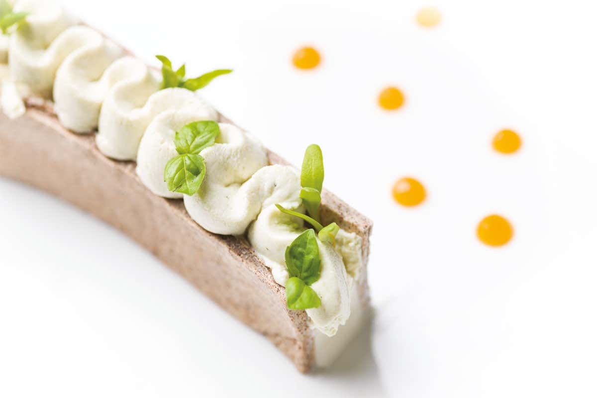 Biscotto alla carruba, mousse al basilico e namelaka all'olio evo