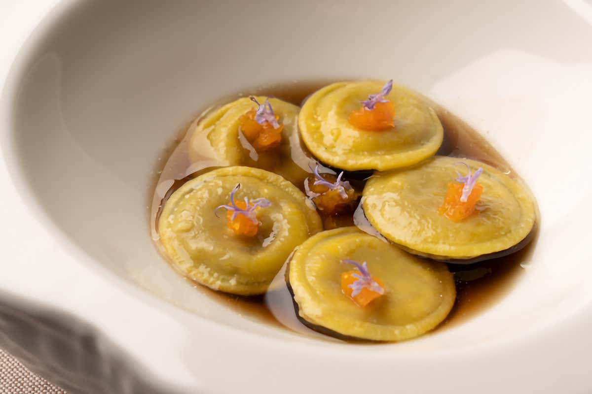 La dolcezza della mostarda di zucca e il sapore deciso del brodo di verdure invernali completano il piatto, regalando un’esperienza gustativa complessa e appagante.