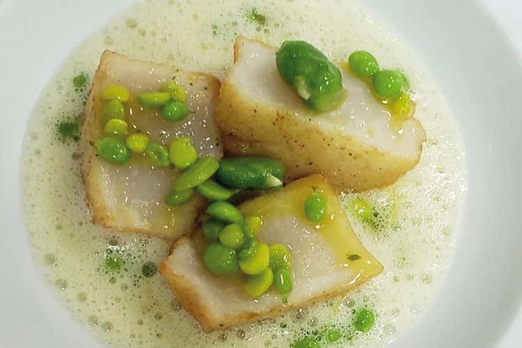 piselli dolciSbianchire le verdure in acqua bollente per pochi secondi e subito raffreddare in acqua e ghiaccio. Rimuovere le bucce e rosolare in un pentolino soltanto con poco olio, sale e pepe. Una parte di questi va frullata con poco olio e acqua per ottenere una crema. Le restanti verdure vanno conservate per la guarnizione del piatto