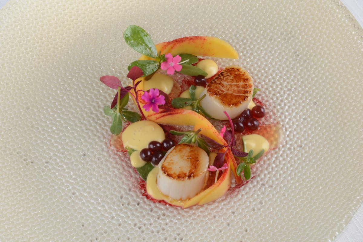 Noci di capasanta, riduzione di “Ultimosole", pesca, portulaca e cipria di barbabietola.