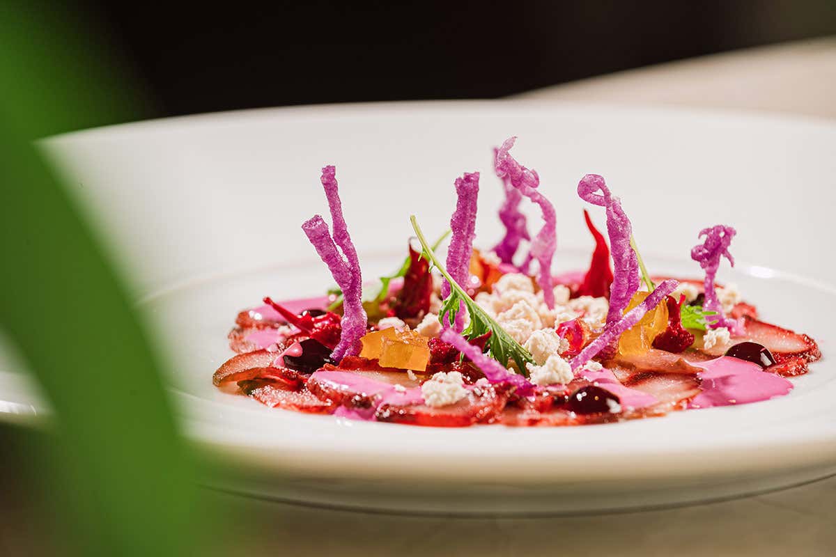 Carpaccio di fragolino, rapa rossa, cavolfiore e mandorle