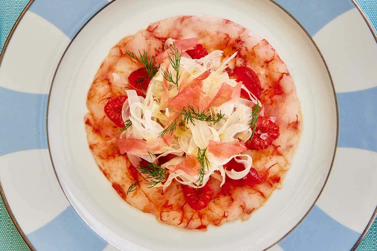 Assemblaggio: togliete il carpaccio dall’abbattitore, togliete la pellicola, e adagiate il carpaccio ancora congelato sul piatto. Emulsionate il dressing al limone e condite leggermente il carpaccio, con un cucchiaino da caffè raccogliete delle piccole quantità di gelatina e distribuite sulla superficie del carpaccio. Distribuite il finocchio, 5-6 fettine di zenzero, qualche pizzico di pepe rosa, e qualche ciuffetto di finocchio selvatico. Condite ancora con emulsione di olio e limone e sale di Maldon prima di servire. A quel punto saranno passati 2-3 minuti e il carpaccio sarà pronto da servire.