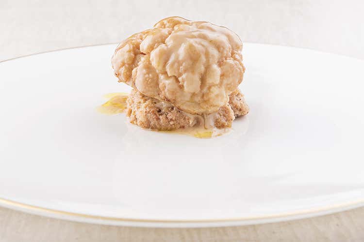 Successivamente prendiamo un altro cavolfiore, lo priviamo delle foglie esterne, lo tagliamo a dadini, lo tostiamo in padella con dell’olio di oliva e lo frulliamo ottenendo una crema, che condiamo con sale e un goccio d’aceto.