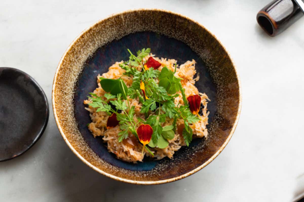 Procedere con l’impiattamento, mettendo sul fondo il chawanmushi, per poi condire con la polpa di granchio. A questo punto si puo` aggiustare il sapore con del sale e del pepe e si puo` aggiungere la salsa di granchio al forno precedentemente ottenuta. Cospargere quindi la superficie con la tempura al carbone e la paprika.