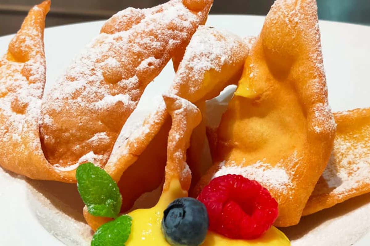 Una volta pronto lasciarlo riposare in frigo almeno per 1 ora dopodiché stenderlo molto sottile, tagliarlo in maniera irregolare e friggere in olio di semi alto oleico, tamponare bene l’olio in eccesso lasciar raffreddare ed impiantare ultimando con lo zucchero a velo.