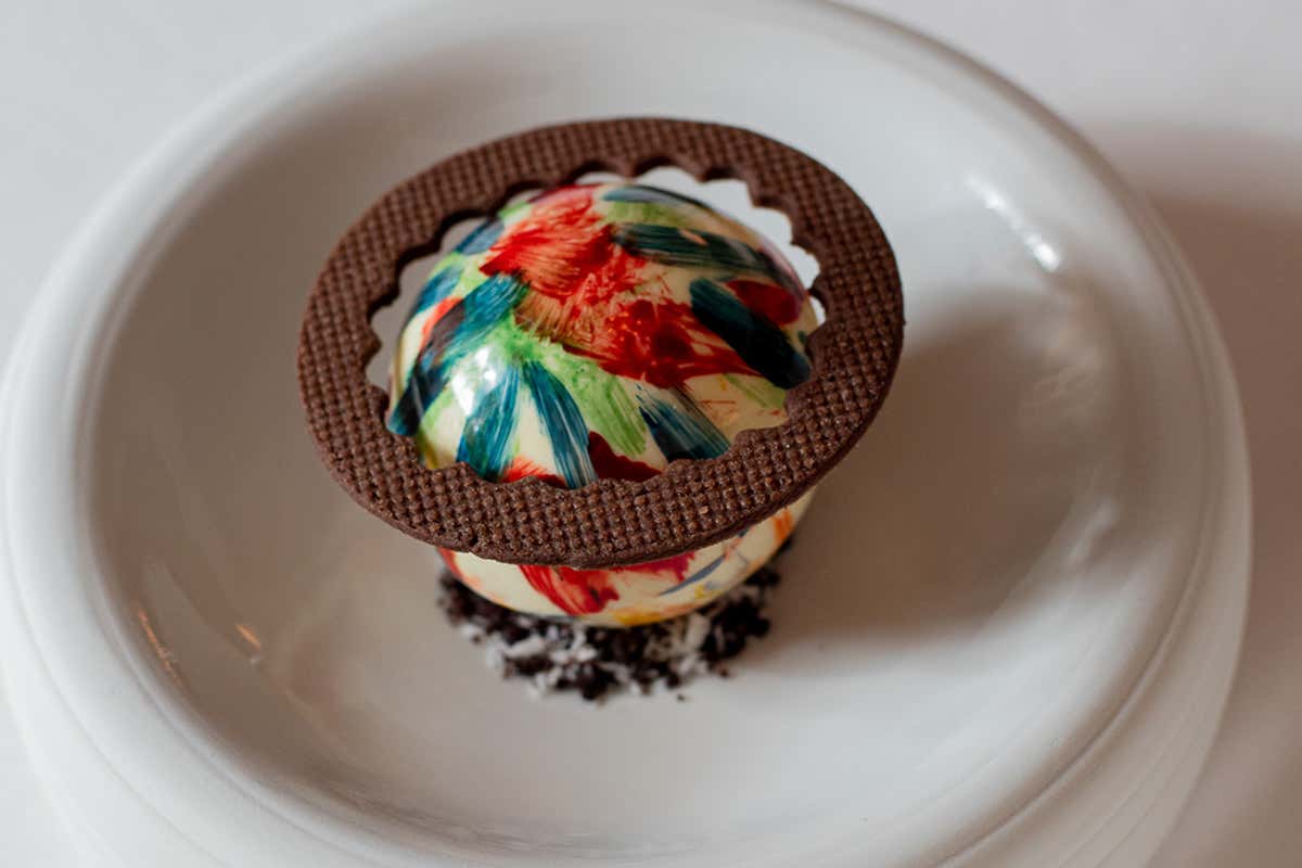 C. Porre subito in frigo a rassodare. Dopo circa 15 minuti, prendere le sfere e iniziare a colorarle con del cioccolato liposolubile di colore giallo, arancio, rosso, lilla, blu e verde, aiutandosi con dei pennelli alimentari. In un piatto, al centro porre un cucchiaio di cake al cioccolato, sopra adagiarvi la sfera colorata e in ultimo il biscotto ad anello che dovrà rimanere a metà sfera. Assicurarvi che la sfera sia completamente decongelata al momento del servizio.