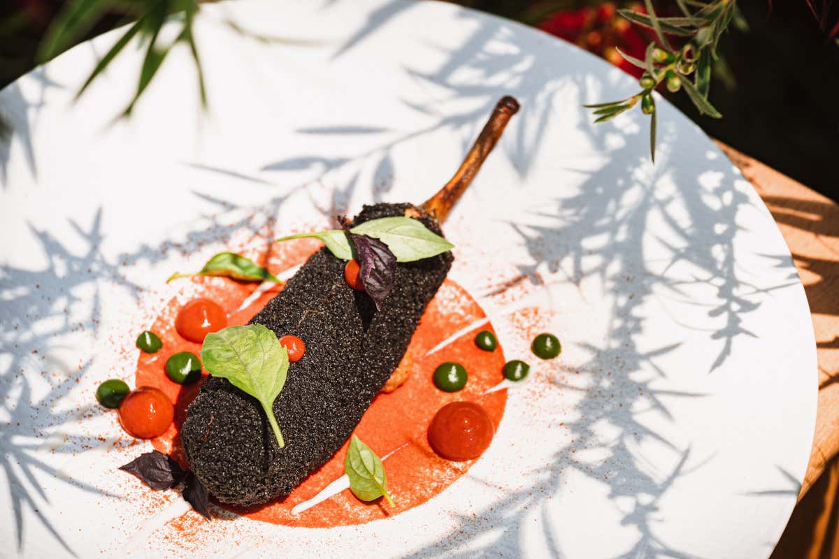 Disporre la finta melanzana al centro del piatto e completare con qualche foglia di basilico fresco.