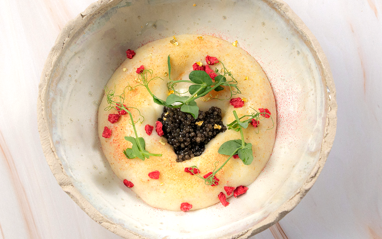 La crema di patate e porri con uovo a 62°, lampone e caviale Beluga Imperial di Caviar Giaveri è un piatto elegante e contemporaneo che unisce comfort e alta cucina. La base, vellutata e avvolgente, esprime la dolcezza naturale di patate e porri, arricchita da una nota cremosa. Al centro, l’uovo cotto a bassa temperatura regala una texture setosa e avvolgente, che si fonde armoniosamente con la crema.