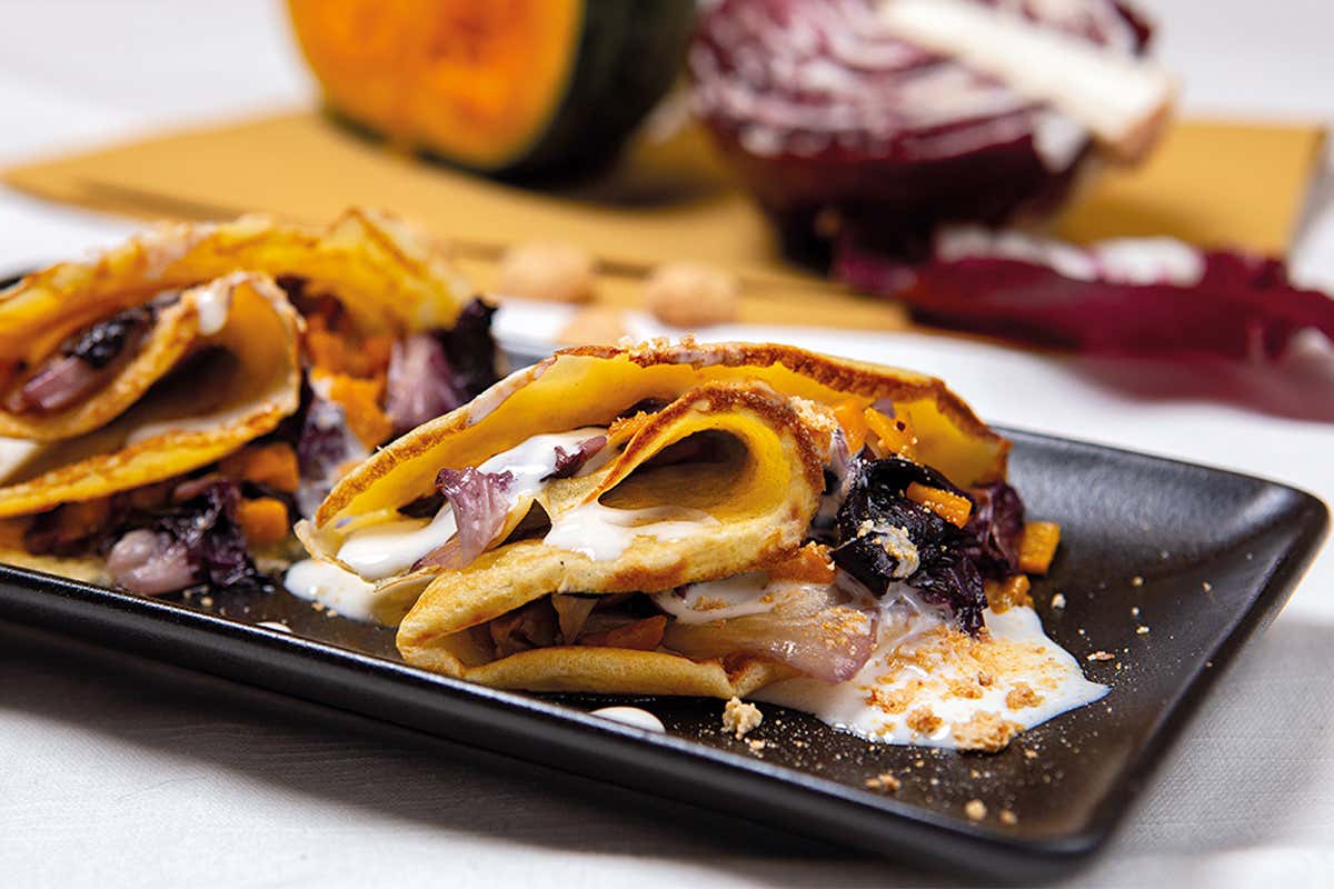 Pur derivando dalla tradizione francese le crespelle sono un piatto con forti connotazioni regionali italiane. Ci sono infatti diverse varianti territoriali e interpretazioni con condimenti e ripieni locali: perfette come antipasto, primo piatto o dessert. Questa ricetta accoglie i sapori ed i colori invernali che troviamo tipicamente sulle tavole del nord est italiano.