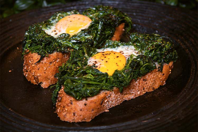 PreparazioneCuocere al vapore 250g di spinaci. Tagliare due fette di pane integrale fresco e adagiarci sopra gli spinaci. Creare un buco in mezzo agli spinaci ed inserire un uovo per fetta all'interno di questo.