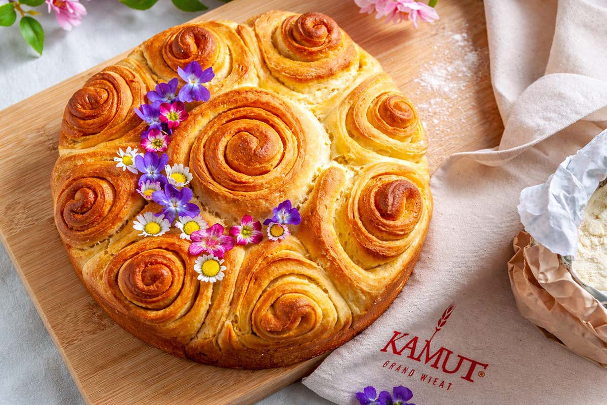 L’impiego della farina di grano khorasan a marchio KAMUT® conferisce all’impasto una personalità unica: il risultato è un dolce armonioso, dal sapore pieno ma equilibrato, capace di valorizzare ogni morso senza risultare eccessivo. Il metodo del poolish e la lavorazione accurata garantiscono una lievitazione ottimale e una texture soffice e filante, che si apre “a petali” proprio come una rosa. Perfetta come dessert pasquale, questa torta si presta anche a momenti conviviali primaverili, dalla colazione lenta alla merenda all’aperto. Un lievitato che unisce estetica e sostanza, tradizione e attenzione alla qualità delle materie prime.
