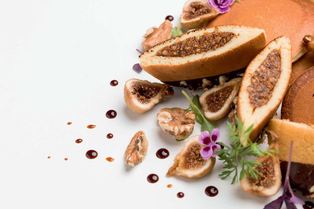 I Dorayaki ai fichi, cioccolato e noci di Lorenzo Alessio sono una golosa variante del celebre dolce giapponese, arricchita dai sapori mediterranei. L'impasto soffice dei dorayaki, fatto con farina e latte intero, racchiude un ripieno ricco e avvolgente di confettura di fichi e fichi alla contadina, con un tocco di melassa di fichi per intensificare la dolcezza.