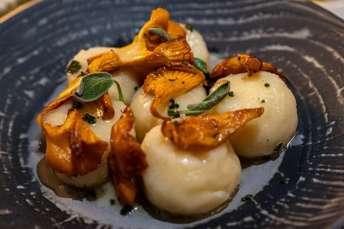 Il condimento valorizza la stagionalità: i finferli, saltati velocemente per preservarne aroma e texture, dialogano con la dolcezza lattica del burro di malga. La polvere di salvia croccante chiude il piatto con una nota erbacea e fragrante, aggiungendo contrasto e profondità. Un primo piatto che unisce tecnica, territorio e comfort food, mantenendo equilibrio e pulizia gustativa.