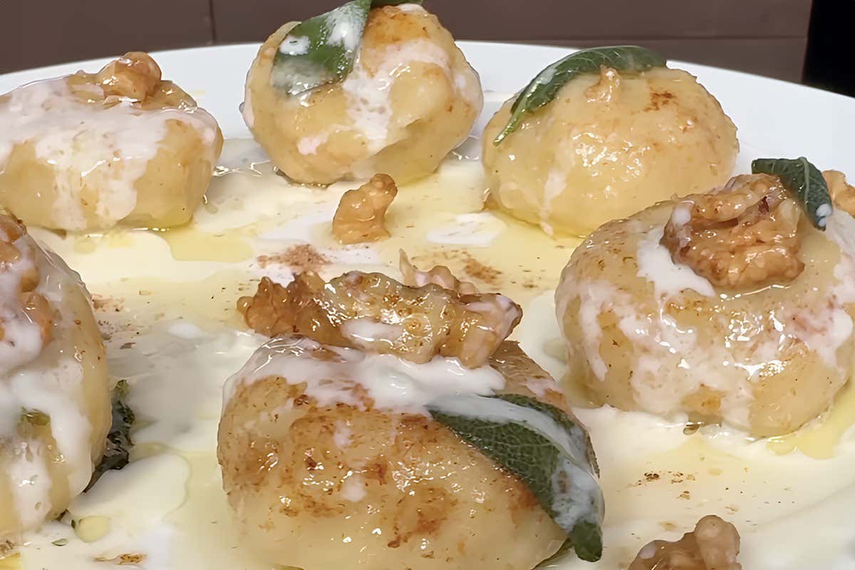 Gli gnocchi ripieni di Gorgonzola dolce Palzola rappresentano un equilibrio perfetto tra tradizione e golosità. La delicatezza dell’impasto di patate incontra la cremosità del Gorgonzola, protagonista sia nel cuore degli gnocchi sia nella salsa finale. Il burro profumato alla salvia e la nota croccante delle noci completano un piatto elegante, intenso ma armonico, ideale per valorizzare un formaggio d’eccellenza come il Gorgonzola dolce Palzola.