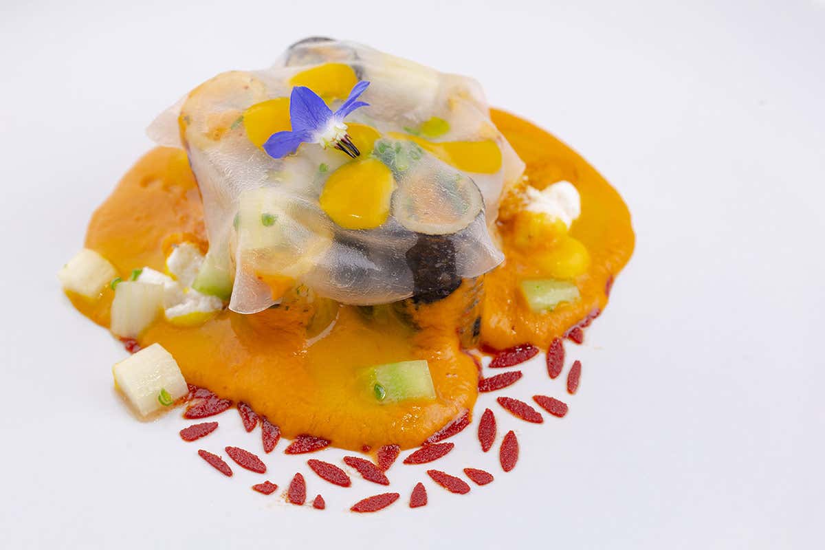 A completare la preparazione interviene l’elemento marino con orata marinata, avvolta insieme alla pasta in alga nori, che introduce un richiamo alla cucina giapponese. Accanto, una fresca insalatina di sedano, cetriolo, mela verde e salicornia aggiunge croccantezza e acidità, bilanciando la cremosità del ripieno e delle salse. Il risultato è un piatto complesso ma armonico, in cui la tradizione italiana della pasta incontra suggestioni internazionali e ingredienti simbolo del territorio pugliese, dando vita a una composizione elegante e moderna.