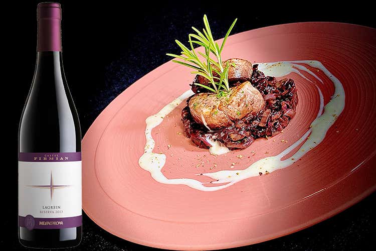“Filetto di maialino con radicchio di Chioggia sfumato al Lagrein, servito su fonduta di gorgonzola” è un piatto complesso e strutturato che premia sapori e contrasti con un ampio bouquet di profumi e sensazioni. Il radicchio di Chioggia, famoso e apprezzato per il suo intrigante profumo in cottura e la caratteristica tendenza amara, si sposa egregiamente con l’affinamento prolungato in barriques e la nota morbidezza del Lagrein. Altresì importante la “pepatura” e la finezza della carne che va ad amplificare le note terziarie piacevolmente speziate ed eleganti del vino.
