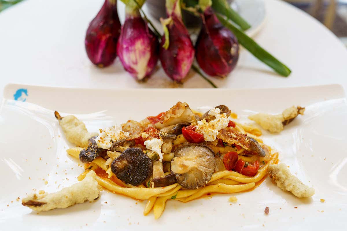 Maccheroncino al ferrettoPreparazione Soffriggere per 5 minuti 100 g di guanciale tagliato a cubetti con due foglie di cipolla aggiungendo funghi pomodorini ed un pizzico di prezzemolo.