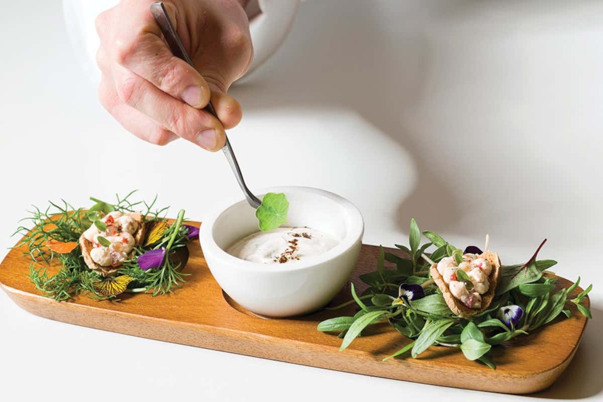 Decorare i fingerfood con pepe rosa, foglioline di maggiorana, polvere di caffè e accompagnare il tutto con la salsa di panna e cardamomo.