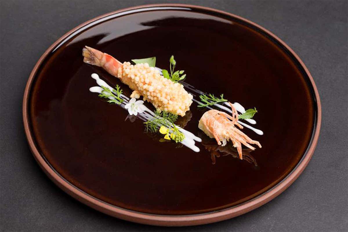 Le mazzancolle e tapioca con ristretto di pesce e salsa al cocco, firmate Fabio Mauro Tommaso Gallo della Nazionale Italiana Cuochi, sono un piatto di alta cucina che combina tecnica, contrasti e suggestioni esotiche in una costruzione elegante e contemporanea. Le mazzancolle, lavorate con precisione e valorizzate anche nella loro componente estetica, vengono laccate con un ristretto di pesce intenso e aromatico, quindi avvolte nella tapioca per ottenere una texture croccante e leggera grazie a una frittura rapida. Il risultato è un equilibrio perfetto tra succosità interna e croccantezza esterna.