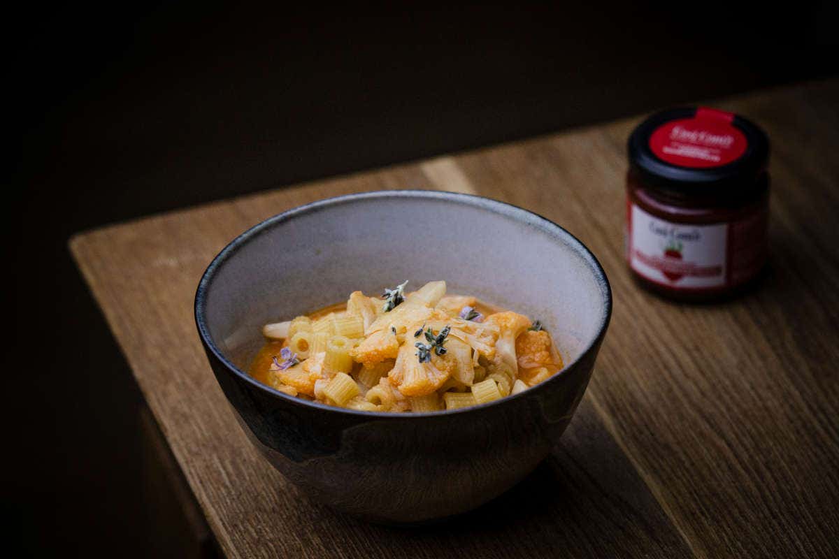 La minestra di cavolfiore con tubetti e doppio concentrato Così Com’è è una ricetta dello chef Massimiliano Contegiacomo che unisce sapori tradizionali con un tocco di innovazione. Questo piatto, perfetto per le fredde giornate invernali, combina la delicatezza del cavolfiore con l'intensità del doppio concentrato di datterino rosso, creando un'esperienza gustativa unica.