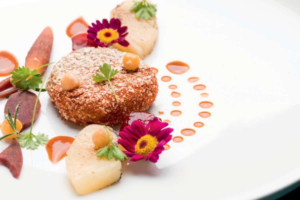 Dopo essere impanati e rosolati in burro chiarificato, i mondeghili si servono con ananas marinato e grigliato, che aggiunge una nota dolce e affumicata. Completano il piatto carote baby cotte in burro chiarificato e una salsa di manzo alla soia, il tutto guarnito con erbe aromatiche e fiori eduli. Un piatto complesso sia nei sapori che nelle consistenze.