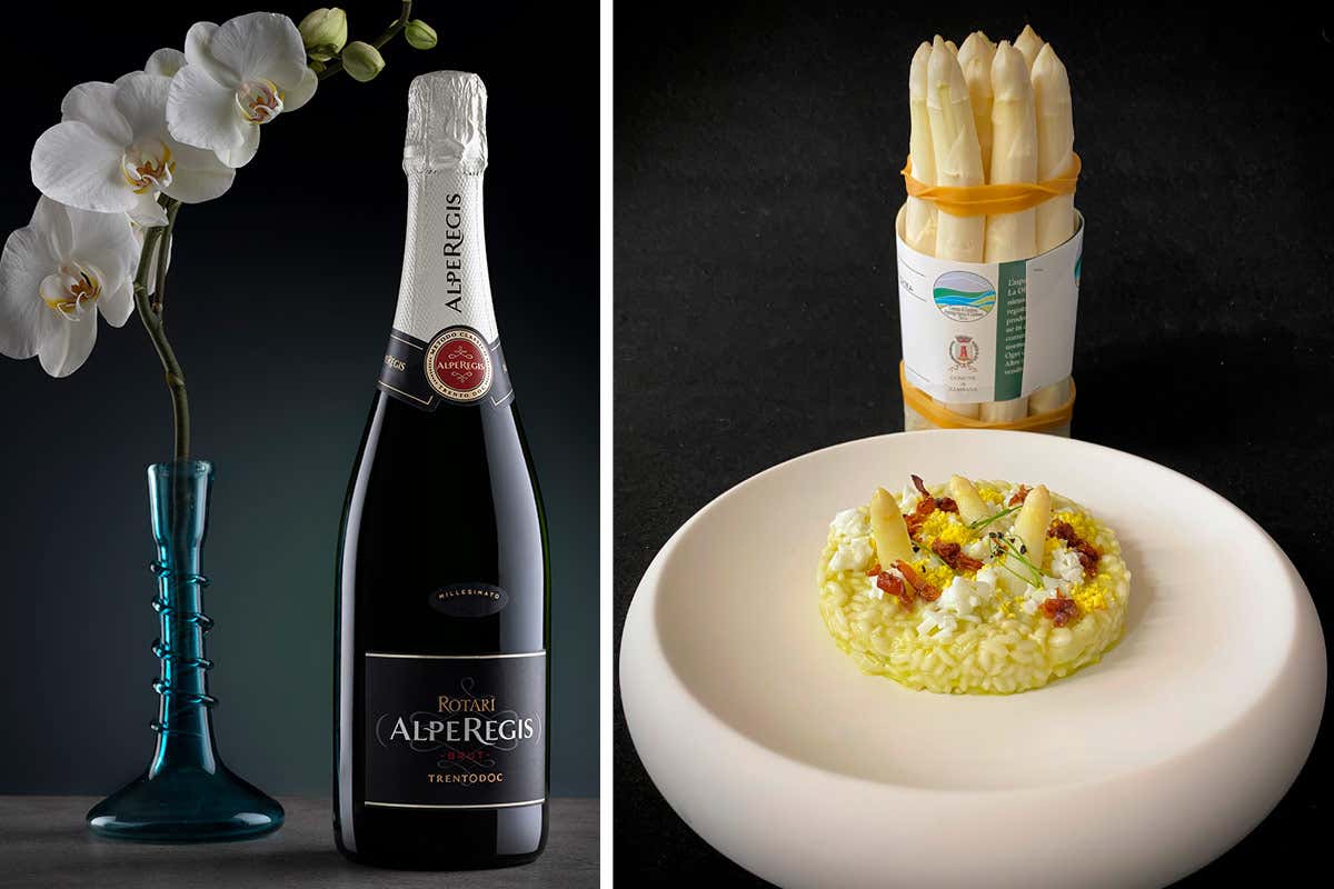 Aperitivo di classe superiore, presenta la struttura ideale anche per accompagnarsi a tutto pasto con primi elaborati e secondi di pesce. È perfetto in abbinamento con il “Risotto Vialone Nano con Asparagi bianchi di Zambana De.Co., uova mimosa, pancetta e clorofilla di prezzemolo” di Stefano Goller, presidente dell’Associazione Cuochi Trentini.