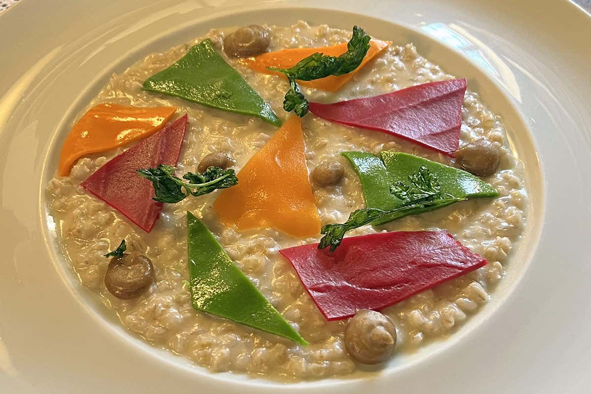 Preparare l’orzotto come fosse un risotto cuocere per circa 40 minuti, mantecare con il burro e il formaggio di malga e servire impiattando su piatto piano e guarnire con le gelatine ( preparate precedentemente facendo bollire estratti di verdure con l’aggiunta di agar-agar) tagliate a triangoli e il prezzemolo fritto.