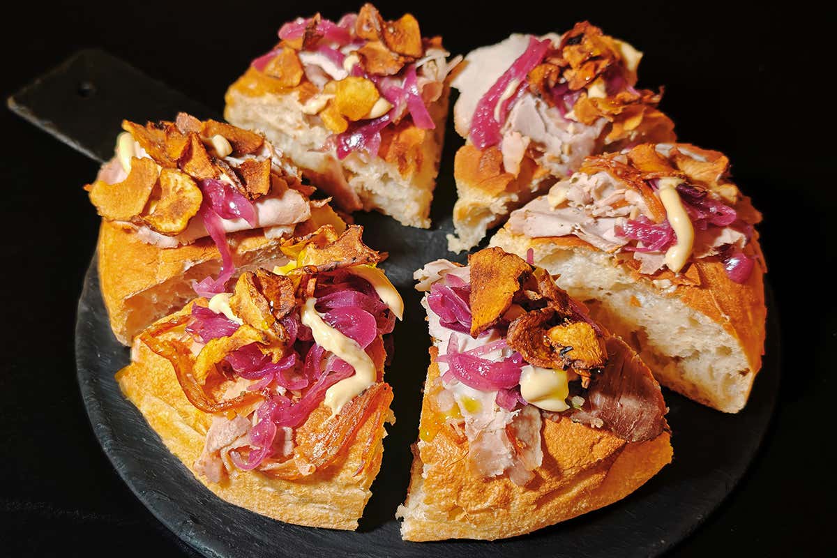 Il padellino “Porchetta in Tour” è una pizza contemporanea che racconta l’Abruzzo attraverso tecnica, materia prima e memoria gastronomica. L’impasto diretto, idratato al 70% e lasciato maturare per almeno 24 ore, garantisce una base soffice e ben alveolata, cotta in forno con leggera immissione di vapore per favorirne lo sviluppo. La farcitura celebra il territorio: porchetta artigianale pluripremiata di Luco dei Marsi, succosa e aromatica, cipolle in agrodolce che aggiungono una nota dolce-acida, maionese alla senape con miele di acacia per rotondità ed equilibrio, chips di topinambur croccanti per contrasto materico e una delicata spolverata di zafferano di Navelli a chiudere il piatto.