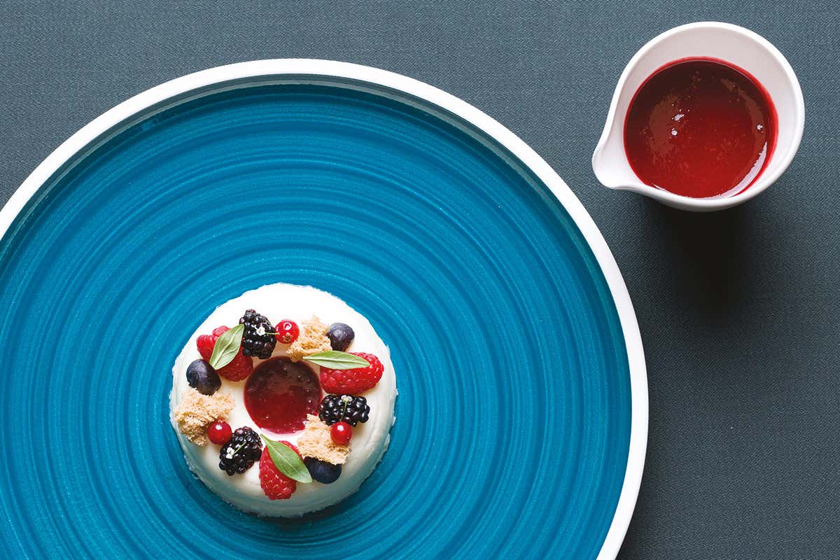 Panna cotta con frutti di bosco e sponge alla nocciola.