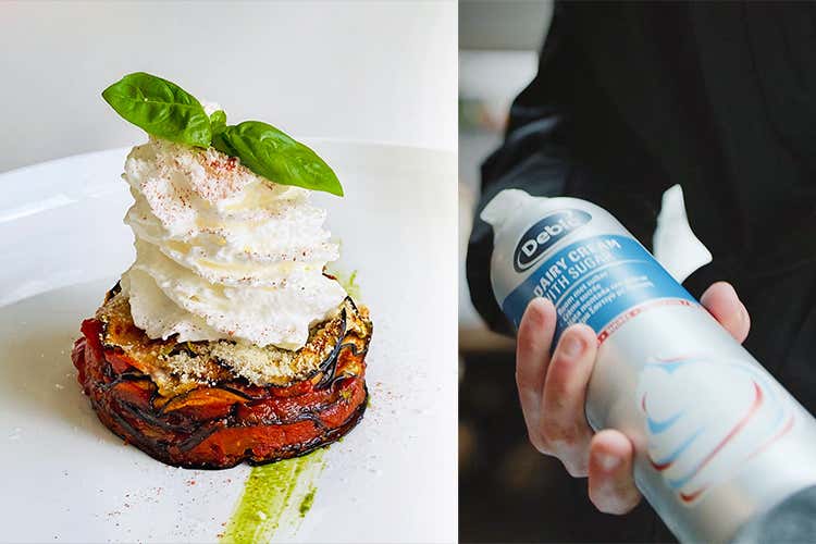 Per la finitura: Panna Spray Non Zuccherata Debic, polvere di pomodoro, Parmigiano Reggiano