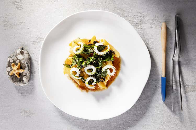 Penne rigate, burro ai ricci di mare, capesante essiccate, erbe spontanee, seppia ai carboni - Moreno Cedroni