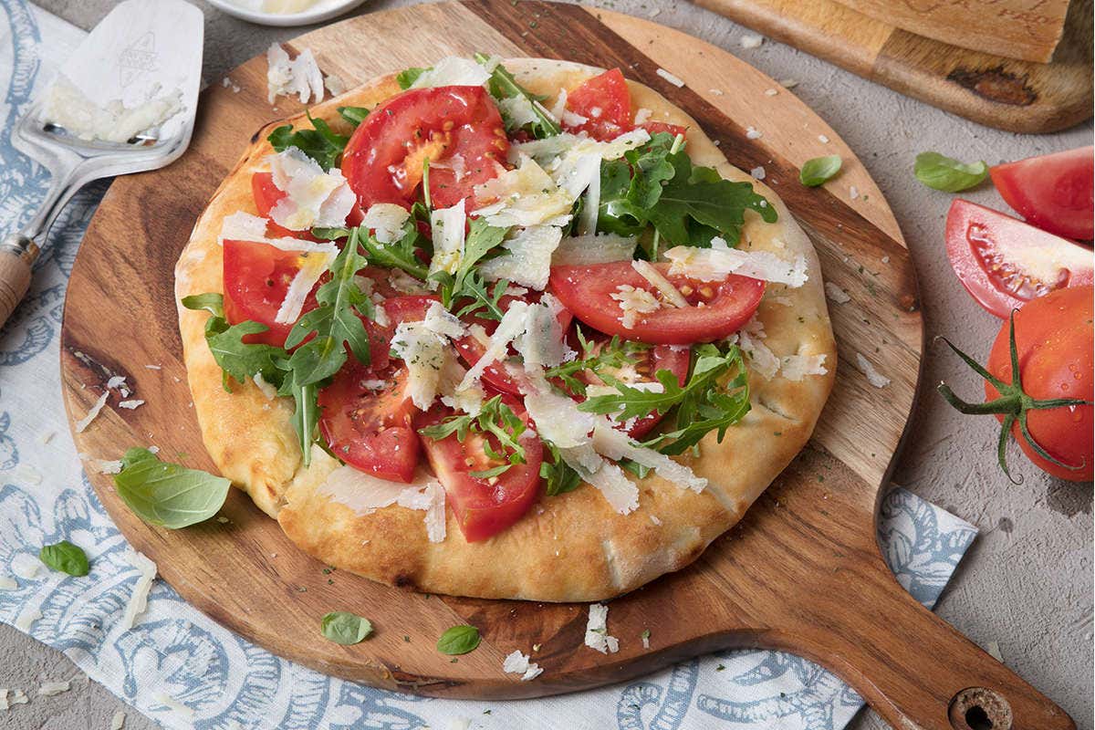 La pizza bianca con pomodori freschi, rucola e scaglie di Grana Padano Dop Riserva è una soluzione leggera ma gustosa, perfetta anche per chi segue una dieta senza lattosio, essendo il Grana Padano naturalmente privo di tale componente come conseguenza del suo particolare processo di produzione.