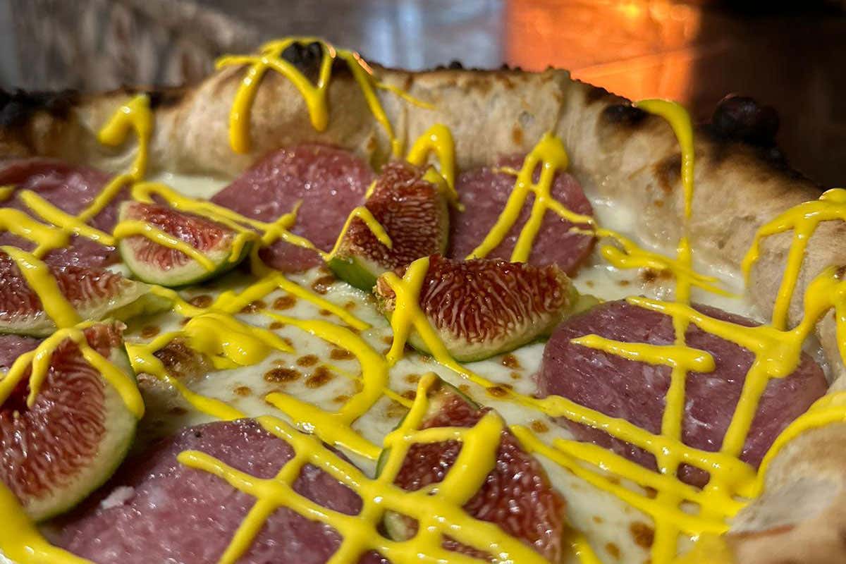 Dopo cotta la pizza viene condita con del ciauscolo di Norcia, fichi biologici e crema di zafferano dell’azienda agricola Tescari.