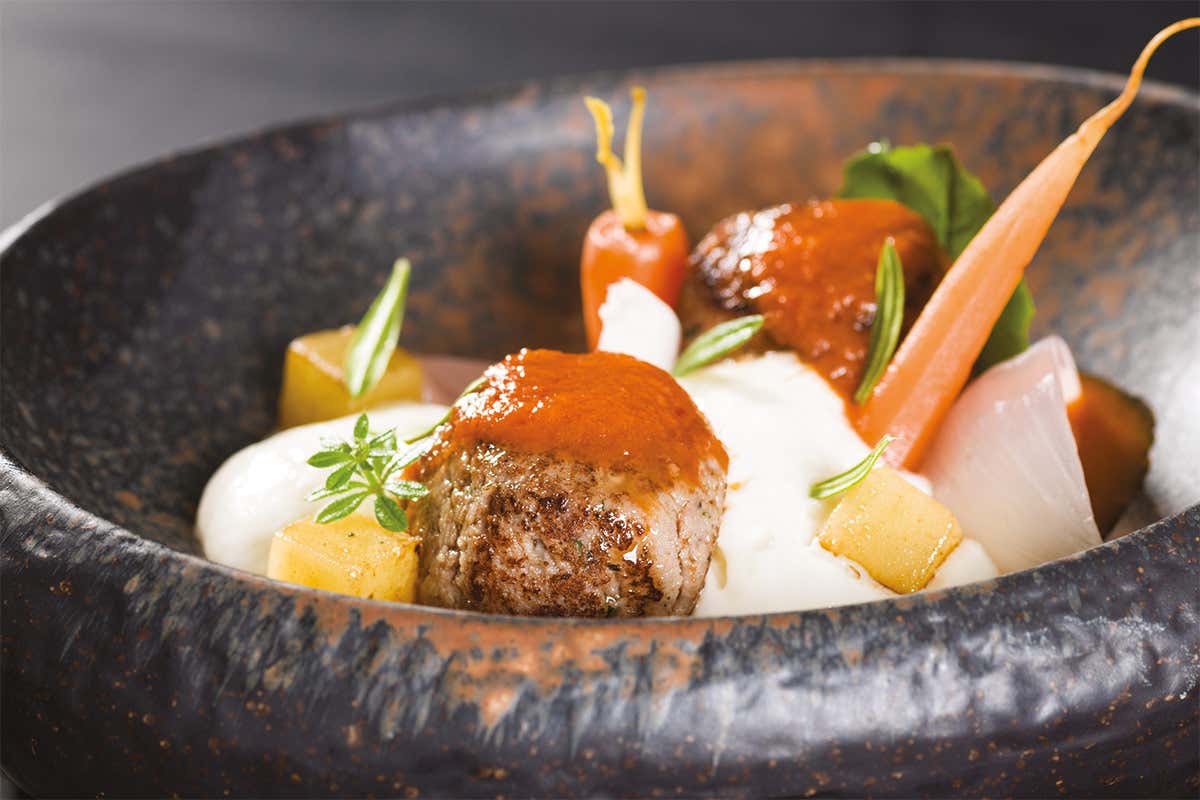 4. Per le guarnizioni sbucciare le patate e formare dei cubettoni, sbianchirli in acqua bollente, asciugare e friggere. Mondare le carote, sbianchire in acqua bollente e saltare in padella con olio evo e sale. Cuocere la cipolla sotto il sale in forno per 40 minuti, sbucciare e ricavare 20 faldine.