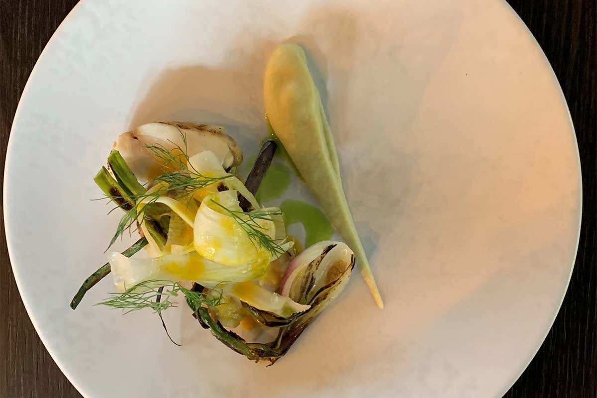 Rana pescatrice della Cornovaglia ai carboni, salsa yakitori, finocchi, cipollotti e riduzione di peperoni