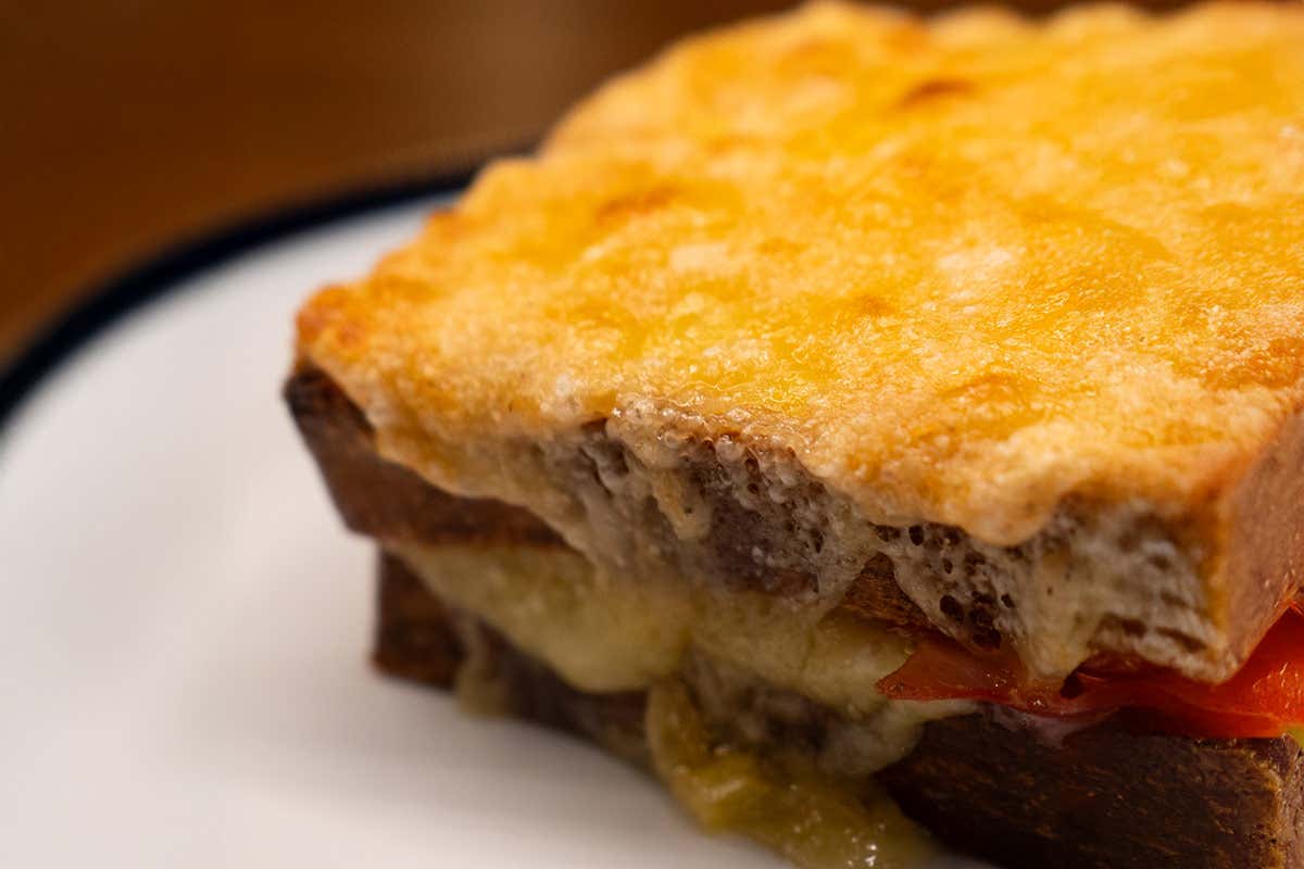 Scaldare leggermente in modo da far sciogliere il formaggio e aggiungere su una fetta la collinetta. Chiudere il panino e far tostare la parte esterna. Mettere sul panino un’abbondante dose di salsa Mornay e la Fontina grattugiata spessa e mettere a gratinare fino a doratura.