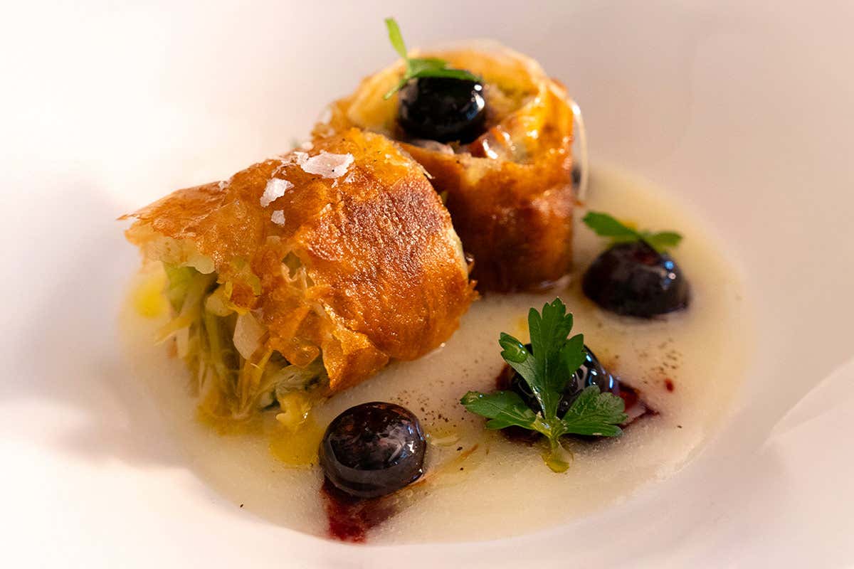 L’“Involtino primavera valdostano” dello chef Andrea Provenzani è un piatto che fonde tecnica, territorio e creatività. La croccantezza della pasta fillo avvolge un cuore filante di Fontina DOP a lunga stagionatura, accompagnato dalla dolcezza di porri e verza stufati. La crema vellutata di patate dona equilibrio e rotondità, mentre i mirtilli fondenti al vino rosso aggiungono una nota agrodolce elegante e profonda.