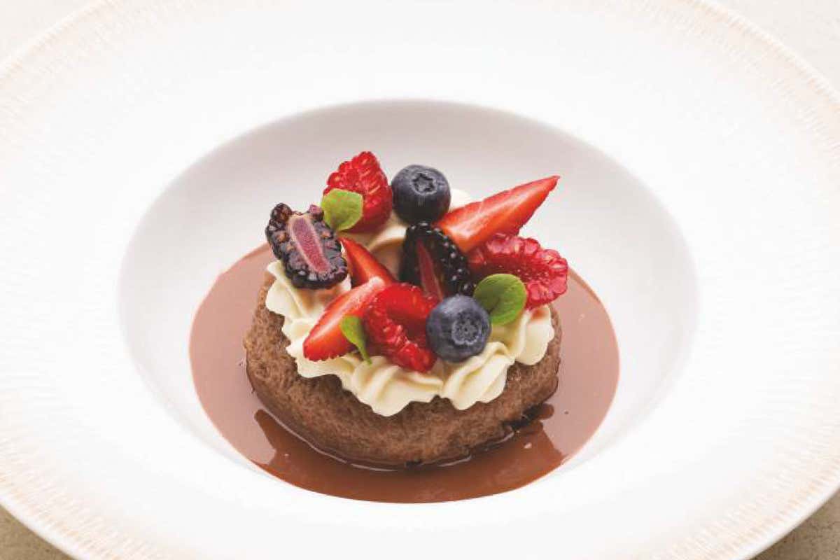 La finitura con frutti di bosco freschi dona freschezza, acidità e colore, completando un dessert moderno che unisce tecnica professionale, eleganza estetica e attenzione alle nuove esigenze alimentari.