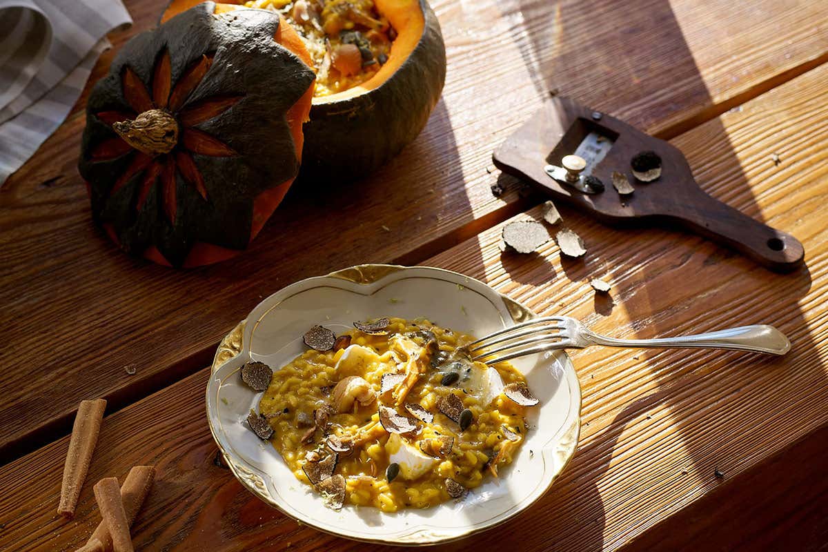 L’impiattamento scenografico - il caldo risotto servito all’interno della zucca svuotata - diventa il tocco d’autore: una presentazione sorprendente che rinnova con creatività un grande classico di stagione.