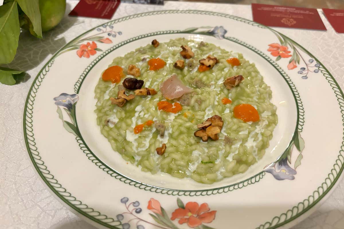 La ricetta del Risotto alla cicoria selvatica, sbriciolata di maialino, ricotta e pomodoro secco e noci tostate dello chef Luigi Alioto dell'Hotel Savoia Palace a Madonna di Campiglio (Tn), un piatto che unisce tradizione e creatività, celebrando i sapori autentici della cucina italiana.