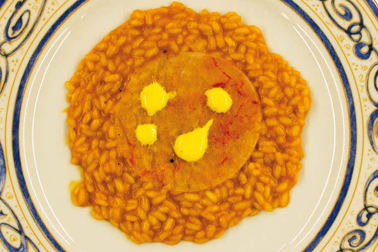 PreparazioneVersare un filo d’olio in un tegame e tostare il riso per qualche minuto. Bagnare con la bisque di crostacei. Emulsionare la burrata con lo zafferano sciolto in mezzo bicchiere di latte tiepido. Grattugiare la scorza del limone. A cottura ultimata, mantecare il risotto con il burro, il Parmigiano, la scorza e ¾ di burrata. Aggiustare di sale e pepe. Versare il riso nel piatto e livellarlo bene. Adagiarvi sopra il carpaccio di gamberi e terminare con ciuffi di burrata.
