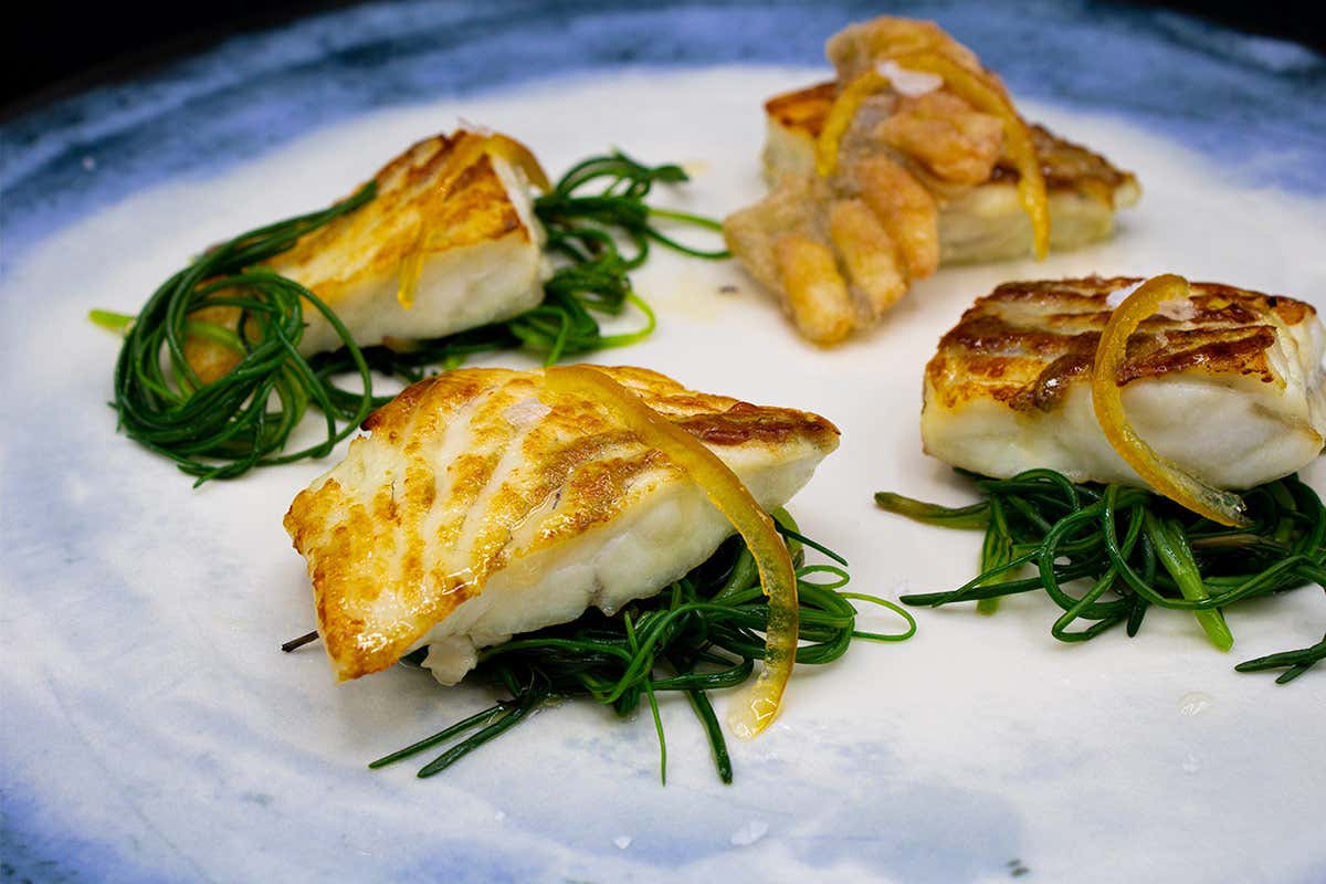 Rombo laccato al limone e camomilla con agretti e polvere di capperi