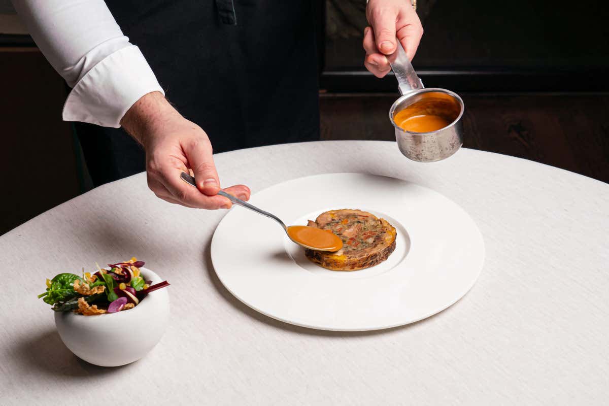 Lo chef Simone Perata del ristorante A Spurcacciun-a a Savona (Sv) presenta questa ricetta tratta dalla guida TavoleDoc Liguria. La Royale di faraona alla cacciatora è un piatto ricco e raffinato che rende omaggio alla grande tradizione culinaria italiana, ispirandosi alla cucina di corte di Marie-Antoine Carême. Questa ricetta esalta il gusto intenso della faraona, abbinata a un ripieno saporito di guanciale, olive taggiasche, funghi porcini e fegatini glassati al Marsala, il tutto avvolto da una cottura lenta e delicata che rende la carne tenera e succosa.