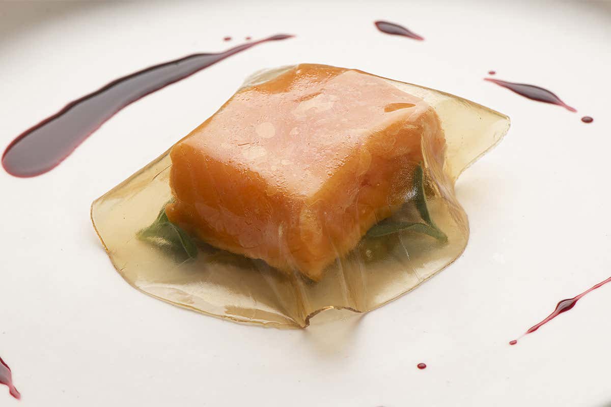 Ingredienti per due persone: (per il salmone) 200 gr di pavé di salmone, sale Maldon affumicato, olio extravergine di oliva; (per gelè di Tosazu) 100 gr di Tosazu, 2/3 gr gelatina vegetale in polvere; (per l’estratto di rapa rossa) 1 rapa rossa cruda, alcune gocce di tabasco; (per la salsa di finocchi) un finocchio, olio extravergine, sale; (per la giulienne di finocchi) mezzo finocchio, 20 gr di succo di arancia, 20 gr di caffè espresso ristretto, sale, olio extravergine di oliva; germoglio olio extravergine.