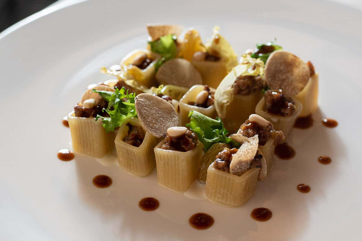 Mettere a bagno l’uvetta in acqua per circa 1 ora. Scolarla e tenerla da parte. Tostare i pinoli a 80°C per 3 ore. Cuocere il Soqquadro in acqua bollente salata. Saltare la scarola in padella rovente. Disporre la pasta nel piatto, farcendola di ragù di capretto. Terminare con la fonduta di caciocavallo appena rigenerata, l’uvetta, i pinoli, la scarola, il tartufo nero e i germogli misti.