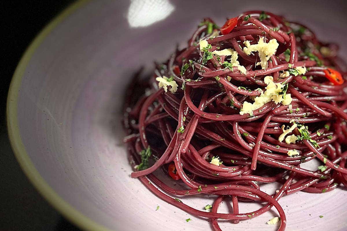 Gli spaghetti al Teroldego Rotaliano e zenzero dell'executive chef Stefano Goller sono un primo piatto dal gusto ricercato che unisce la freschezza dello zenzero alla struttura del vino. Gli spaghetti vengono cotti direttamente nel vino bollente aromatizzato con zenzero, poi spadellati con aglio, peperoncino, prezzemolo e olio extravergine d’oliva. La guarnizione finale con zenzero fresco grattugiato esalta i sapori. Un piatto elegante e aromatico, ideale per valorizzare il Teroldego Rotaliano.
