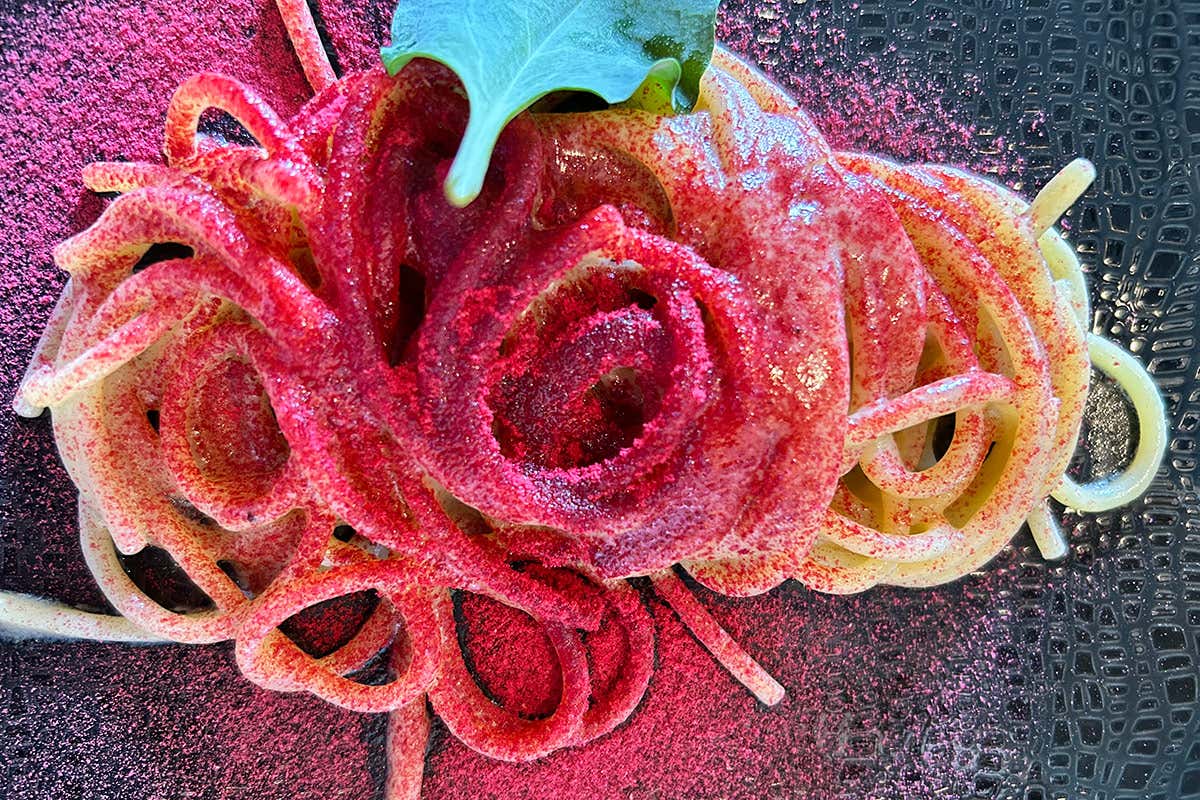 Spolverare gli spaghettoni con polvere di lamponi e chiudere il piatto con una foglia d'ostrica da mangiare alla fine per prolungare il gusto del piatto.