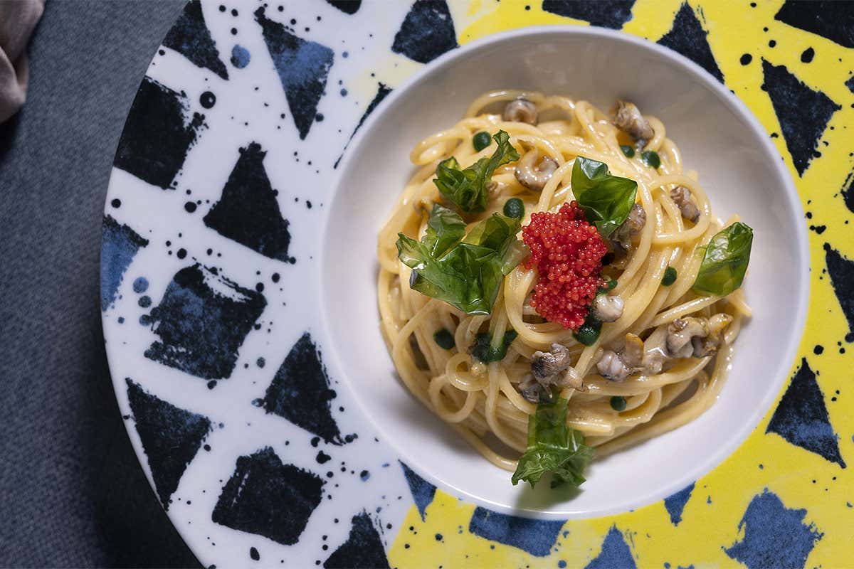 Gli spaghettoni aglio e olio vengono arricchiti dalla dolcezza dei maruzzielli, dalla cremosità della polpa di ricci e dalla delicatezza degli anemoni di mare, creando un perfetto equilibrio tra terra e mare. Il tutto completato dalla croccantezza del tarallo sugna, pepe e mandorle, che dona una nota di contrasto irresistibile.