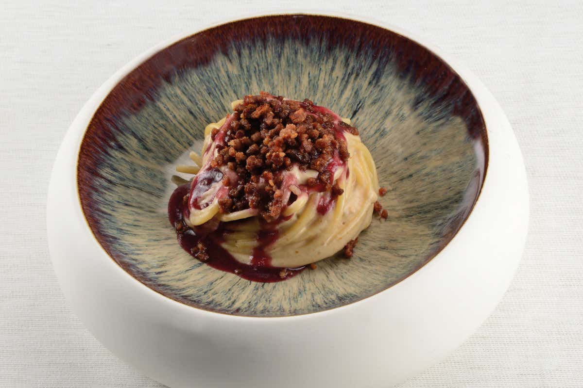 Spaghettone, salsa di noci, culatello piacentino e radicchio.